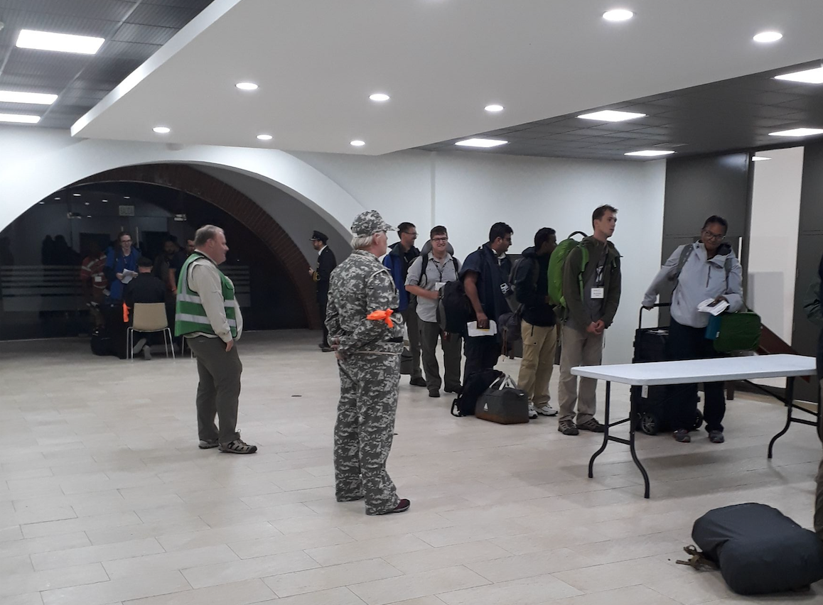 At 7:00 PM the simulation officially kicked-started to tend to the aftermath of Hurricane Alex in the Rominica island (names created for the purpose of the simulation). Finally, they arrived at the island's airport, and technicians and volunteers went through customs and immigration security checks, including typical issues and problems encountered when you land in a country as a volunteer with all sorts of uncommon satellite communication tools.