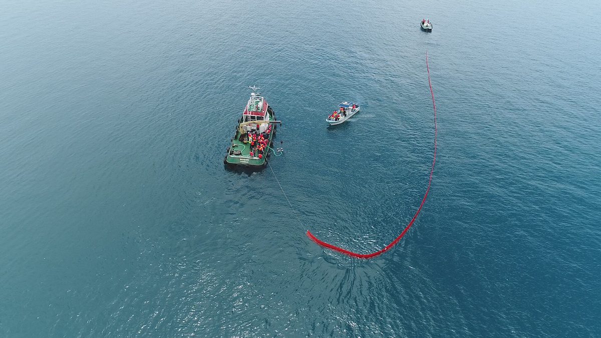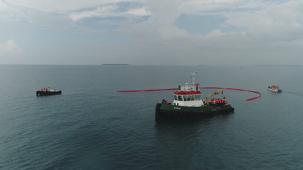 The weather threw us a curveball with heavy rain but we were still able to deploy a multicopter drone to detect the oil spill and identify its parameters. Two boats from the Zanzibar Maritime Authority rapidly reached the site and the drone was also able to assist the pilots to skillfully maneuver an oil containment boom. Finally, the oil was pumped out of the sea into barrels ready for recycling or disposal onshore.