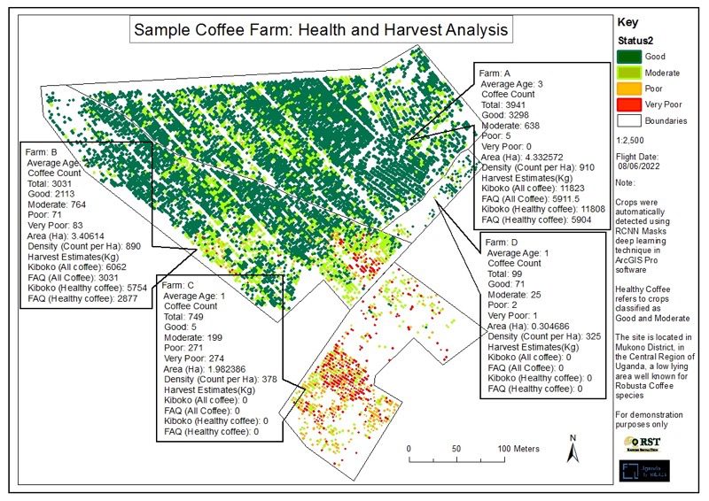 The RCNN Masks deep learning model found in ArcGIS Pro software was used to detect coffee crops on the farm with the provision of samples. The model was able to detect over 7000 stands. The tool proved useful for inventorying and helped develop further analysis.